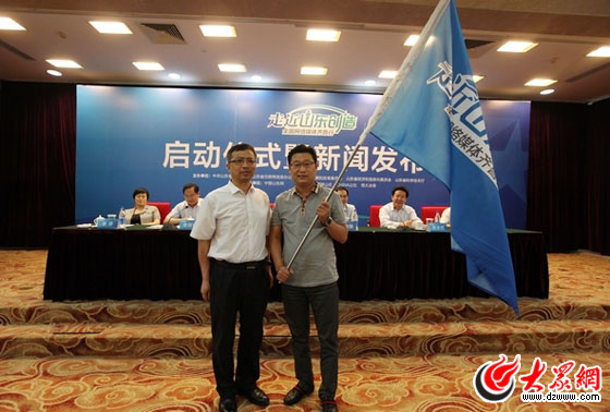 中共山東省委宣傳部副部長(zhǎng)、山東省互聯(lián)網(wǎng)信息辦公室主任李建軍為采訪(fǎng)團(tuán)授旗