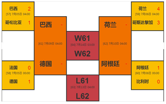 半決賽,巴西vs德國,荷蘭vs阿根廷。四強球隊中巴西、德國、阿根廷總共加起來有10座冠軍獎杯,占據19個冠軍的一半以上;而荷蘭3次獲得亞軍,巴西2次亞軍,阿根廷2次亞軍,德國4次亞軍,總共有11個亞軍,也占據一半以上。