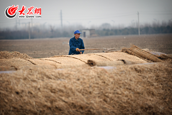 一位韭農(nóng)給韭菜棚蓋保溫草席。楊春衛(wèi) 攝