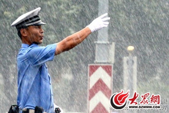 就在他打算跑回休息區穿雨衣時,發現經十路由東往西的車特別多,但是卻都在原地不動。王曰磊跑到東側路口往西一看才發現,由于雨勢太大,從司機們的那個角度根本看不清交通信號燈的顏色。王曰磊二話不說,站在路口充當起了“交通信號燈”,指揮來往車輛安全通行。