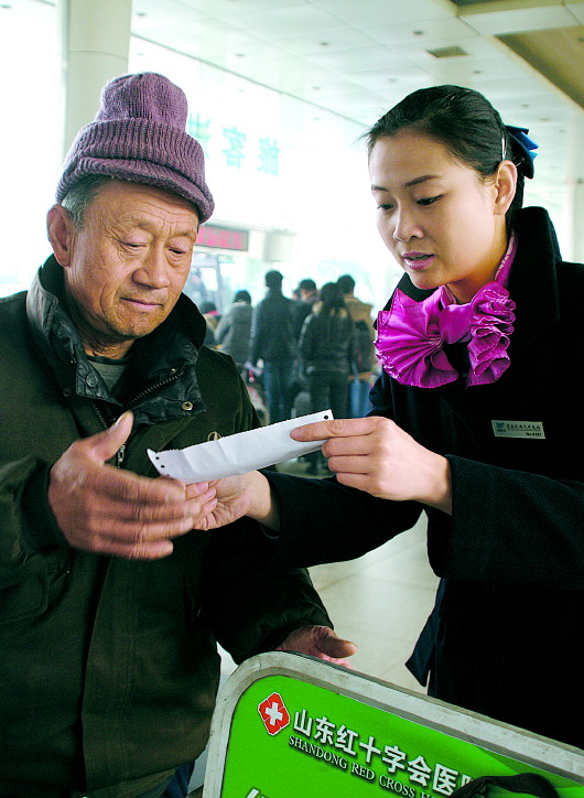 1月3日,濟南長途汽車總站旅客熙熙攘攘,春運氣息漸濃。在車站總服務(wù)臺,雙語站務(wù)員單笑嬌微笑著為旅客服務(wù)。