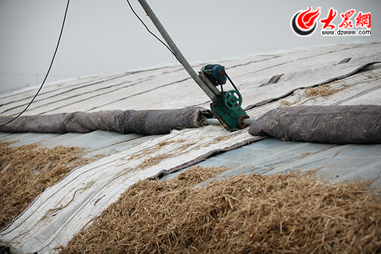 一位韭農給韭菜棚蓋保溫草席。楊春衛 攝