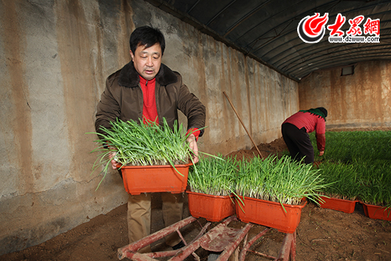 一位客戶從濟南市區開車來惠龍韭園采購盆景韭菜。楊春衛 攝