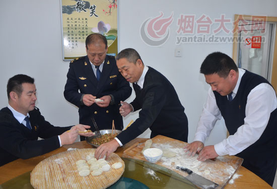 除了2名值班人員外,長島海事處其他4個老爺們除夕上午就開始學著包餃子。