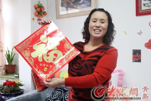 于明大姐拿著福字開心的笑著