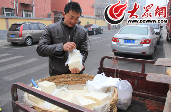 大眾網(wǎng)濟(jì)南2月4日訊(記者 韋輝)“熱豆腐嘍!”臨近年根,家家戶戶在準(zhǔn)備年貨的時候,大魚大肉不能少了,豆腐、年糕這樣的“小菜”也不能沒有。豆腐和年糕由于諧音是“都富”、“年年高”這樣吉祥又有節(jié)日氣氛的名字,春節(jié)期間也成了“搶手貨”。大年三十,是34歲的“豆腐哥”李順昌蛇年出攤的最后一天,這天他賣掉了5筐共350斤的豆腐。