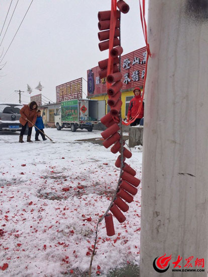 紅色的鞭炮紙散落在積雪上,顯得格外地喜慶
