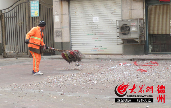 環(huán)衛(wèi)工張師傅早上不到6點就來到自己負責打掃的建新街打掃衛(wèi)生,可是接連不斷的“開門炮”卻讓張師傅折騰了一上午。由于商家們燃放鞭炮的時間不固定,因此張師傅只能在街上等著,店鋪燃放完鞭炮后,他就去打掃,一個上午也沒歇著。
