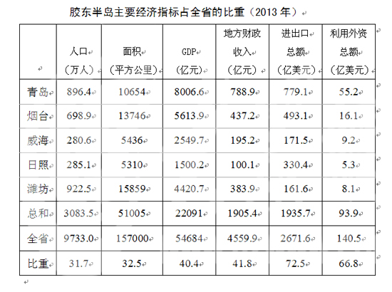 作為中國(guó)第一大半島的膠東半島,是山東經(jīng)濟(jì)實(shí)力最強(qiáng)、開(kāi)放型經(jīng)濟(jì)水平最高、發(fā)展活力足、科研力量較為雄厚的地區(qū)。山東宏觀經(jīng)濟(jì)研究院經(jīng)濟(jì)研究所所長(zhǎng)高福一介紹,2013年,膠東半島五市,以不足1/3的人口和面積,創(chuàng)造了均超過(guò)五分之二的地區(qū)生產(chǎn)總值和地方財(cái)政收入,而且進(jìn)出口總額接近3/4,利用外資超過(guò)2/3。