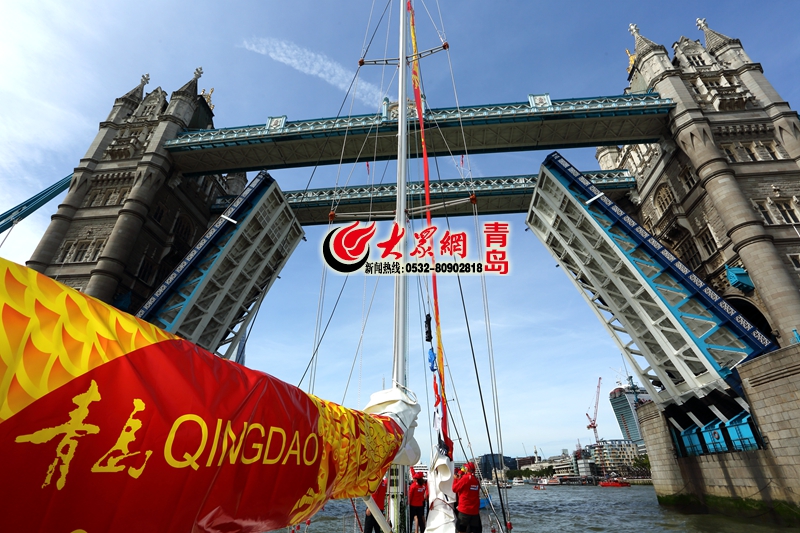 倫敦塔橋下的泰晤士河畔,宋坤手持國旗向岸邊觀眾示意