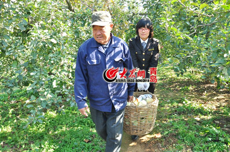 志愿者幫韓大爺搬運摘下的蘋果