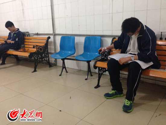 歷城二中的兩位考生在一邊輸液一邊看書 見習記者 孫乘昀攝