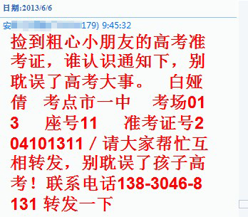 大眾網濟寧6月6日訊(見習記者 韓冉冉)臨近高考,騙子又出新花招。近日來,一條高考生丟了準考證的消息在QQ群中獲得多次轉發:“撿到粗心小朋友的高考準考證,誰認識通知下,別耽誤了高考大事。白婭倩,考點市一中,考場013,座號11,準考證號204101311,請大家幫忙互相轉發,別耽誤了孩子高考!聯系電話138-3046-8131,轉發一下。”記者在網上查詢后發現,該號碼歸屬地為甘肅慶陽,記者撥打該電話后,發現為關機狀態。