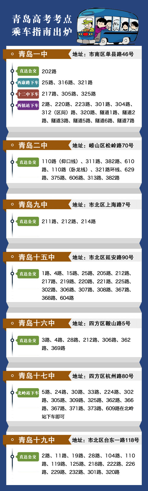 青島市區高考乘車指南出爐 7大考點都有公交