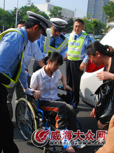 大眾網威海6月7日訊 (通訊員 李世成 記者 王曉青) 6月7日,威海二中學生孫冠華在交警一大隊民警護送下來到威海一中的考場參加考試。孫冠華在6月5日晚上下晚自習時不慎將腳部摔傷,只能以輪椅代步,為幫助她順利完成考試,交警一大隊將在高考期間對其進行接送。