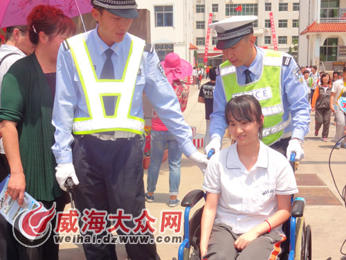 6月7日,威海二中學生孫冠華在交警一大隊民警護送下來到威海一中的考場參加考試。孫冠華在6月5日晚上下晚自習時不慎將腳部摔傷,只能以輪椅代步,為幫助她順利完成考試,交警一大隊將在高考期間對其進行接送。