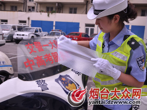 民警在警用摩托車上粘貼“交警一大隊中高考服務車”標識