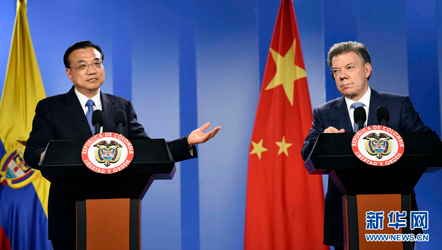 當地時間5月21日下午,國務院總理李克強在波哥大同哥倫比亞總統桑托斯舉行會談后共同會見記者。 新華社記者 張鐸 攝