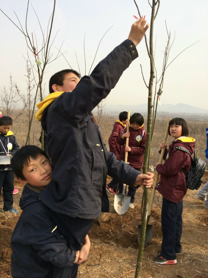 今天濟南有霾,看到灰蒙蒙的天空,學生蘭秉剛自言自語:“希望我們種的樹能茁壯成長,為天空增加一片綠色。”隨后,這個不足一米五的小男孩在心愿卡上寫下二十個字“全國一片綠,綠色行天下,人人講文明,孝心傳四方”。記者注意到,由于樹太高,剛滿13歲的他個頭有限,他就讓學生抱著他把許愿卡掛在樹枝上。他說,他看到不少人用掰彎小樹苗的方式掛心愿卡,他認為這是不文明的行為,這也不利小樹苗的成長。