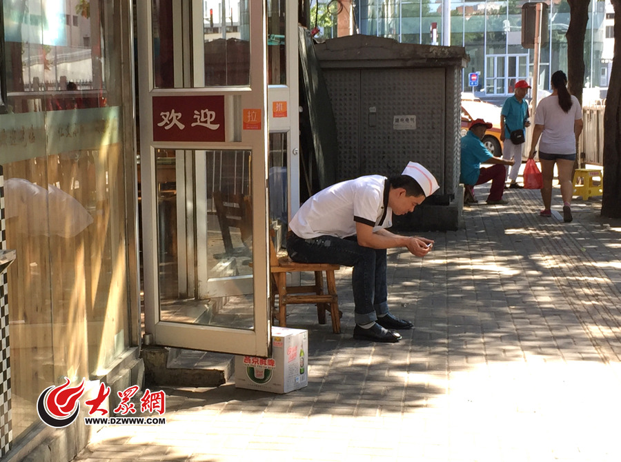 3日上午,北京市一家飯店門口,服務員坐在門口用手機看閱兵直播。(大眾融媒體報道組記者 攝)