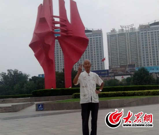 31日上午11時許,77歲的老兵楊擴田站在臨沂人民廣場“山高水長”標志下,擺出勝利“V”字,面露微笑。