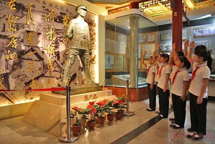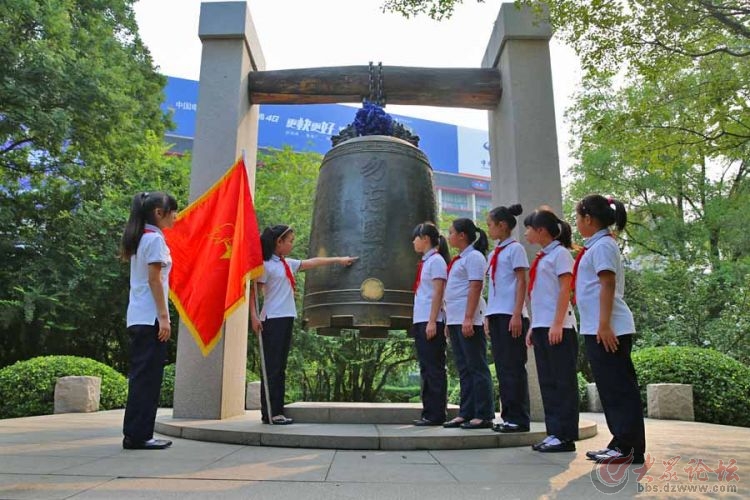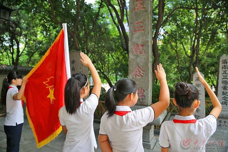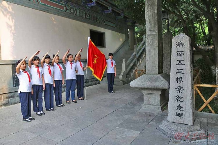 我們是濟南燕柳小學六年級三班少先隊隊員,為紀念抗日戰(zhàn)爭勝利七十周年,來到濟南五三慘案紀念堂,緬懷抗日戰(zhàn)爭為國犧牲的軍民烈士,我們永遠不會忘記日本帝國主義侵略中國所犯下的滔天罪行!我們要努力學習,長大后為祖國貢獻我們的青春!為捍衛(wèi)世界和平貢獻我們的力量!