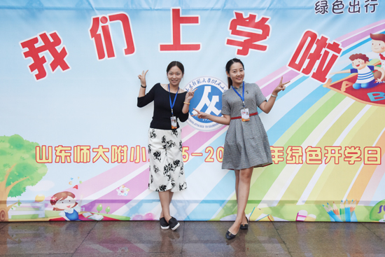 山東師大附小宣傳交流處干事王琳琳(左)和徐靜(右)為大閱兵點(diǎn)贊