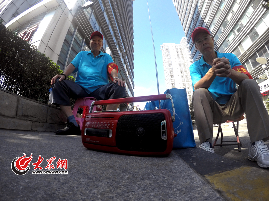 在北京市的一個(gè)路口,治安志愿者們用收音機(jī)收聽(tīng)閱兵直播。(大眾融媒體報(bào)道組記者 攝)