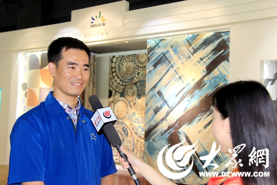 東升地毯集團訂單管理指揮中心主任王仕章向記者介紹本次閱兵式紅毯的制作過程(大眾網記者 張麗 攝)