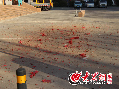 一家門市店門口剛放完鞭炮,滿地碎紙屑。