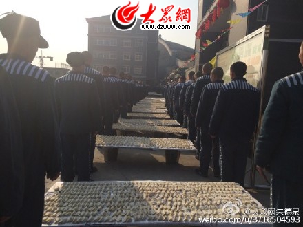 在生活區,一隊隊服刑人員已經抬著自己包好的水餃,在食堂門口列隊,等待依次下水餃,那場面,煞是壯觀。