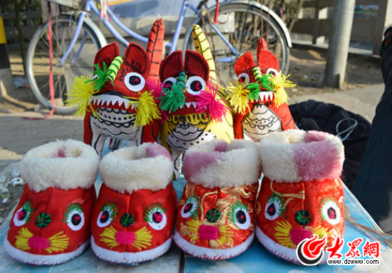 老人親手縫制的布老虎和虎頭鞋。現在會這種手藝活兒的人越來越少,我們也只能在過年這幾天看到她在中山北路“推銷”作品。