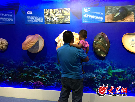 8月15日下午,一位市民帶著孩子在榮成市海洋食品博覽中心參觀。記者 馬俊驥 攝