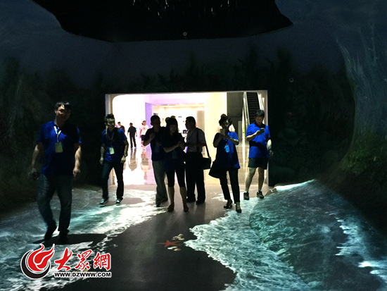 采訪團(tuán)記者走在海洋通道上,3D技術(shù)投射的波浪讓人身臨其境,流連忘返。記者 馬俊驥 攝