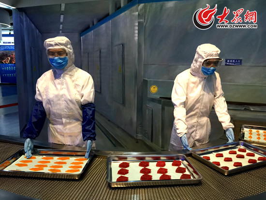 在榮成市海洋食品博覽中心的試吃體驗(yàn)區(qū),采訪團(tuán)記者們合影留念。記者 馬俊驥 攝
