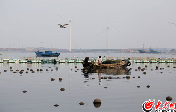 今天下午,采訪團記者們從桑溝灣碼頭乘坐漁家木船開啟海上休閑體驗之旅。漁船在碧藍的大海上緩慢前行,船后翻滾著白色的水花,岸邊的漁船、風車在視線中漸漸消失,一條條浮萍鏈也慢慢的出現在眼前,成群結隊的海鷗,你追我趕的搶奪著游人拋撒在海中的食物。隨行的桑溝灣海洋牧場劉經理告訴我們,漁民常年“吃穿住”在海中漂浮的房屋中,他們日出而作,日落而息,牧海而耕。劉經理稱,因地理位置優越、天然水質優良,海產品產量高、品質佳,桑溝灣出產的扇貝,曾作為國宴用品招待過美國前總統尼克松。