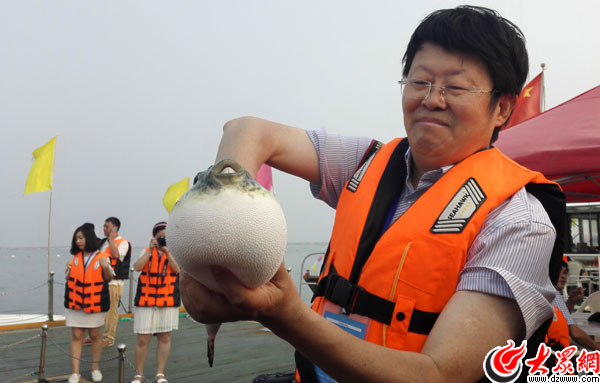 從一樓的池中撈出一條河豚,拍拍它的肚子,漸漸地鼓得像個白球,引得記者一陣陣歡笑。玩累了,一盆剛出鍋的海鮮大雜燴上桌,七八個人圍坐在一起,吃得不亦樂乎。吃完海鮮再來體驗一把海上垂釣,沒有魚鉤的釣竿,讓記者們充滿懸念。