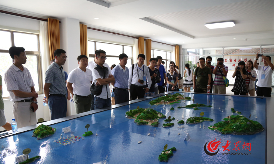 采訪團在長島海釣基地的長島縣沙盤前聽取長島情況介紹。記者 孫晨 攝