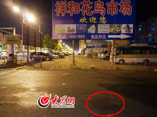 當晚22時許,大眾網記者趕到事發現場——芝罘區福河路和幸福中路交叉口北側祥和花鳥市場附近。雖然夜色已深,但地面上的血跡仍然十分刺目。事發地點東10米有一家報刊亭,報亭的老板告訴大眾網記者,當時,兩名身穿便服的民警與犯罪嫌疑人進行搏斗,犯罪嫌疑人掏出刀刺向其中一名民警頸部后逃走。在搏斗過程中,有一名看上去約四五十歲的市民也沖上前一起與歹徒搏斗。