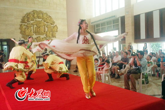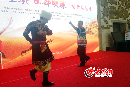大眾網濟南8月13日訊(記者 趙兵) 13日下午,山東省文化館內,一場原汁原味的新疆歌舞表演正在二樓大廳上演。表演一結束,一位大爺就拉著維吾爾族舞者的手說:“小伙子,快教我兩個動作,我也要學!”優美的舞姿和大爺的熱情,讓前來參觀“絲路風情,醉美喀什”文化展的群眾開懷大笑。