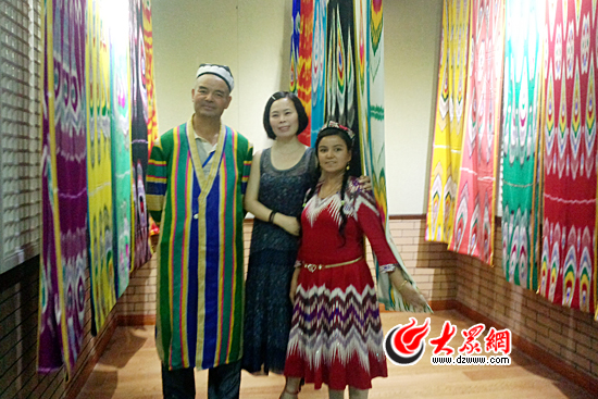 參展市民在充滿新疆風情的艾德萊斯綢前合影留念