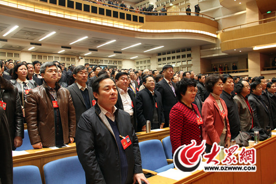 1月26日上午9時,中國人民政治協(xié)商會議第十一屆山東省委員會第三次會議在濟南隆重開幕。圖為全體政協(xié)委員起立唱國歌。大眾網(wǎng)記者 馬俊驥 攝