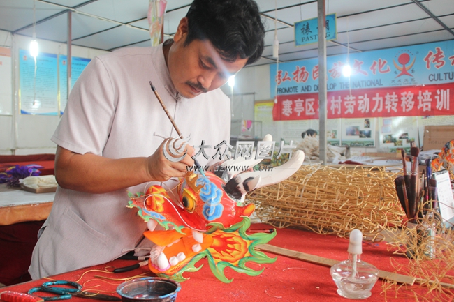 走進(jìn)濰坊市寒亭區(qū)楊家埠村,仿佛置身于年畫風(fēng)箏藝術(shù)的展覽館:大門上的門神年畫、村子上空“翱翔”的大金魚風(fēng)箏以及各類風(fēng)箏樣式的裝飾物等,讓人目不暇接。王永訓(xùn)的天成風(fēng)箏廠,就隱匿于此。