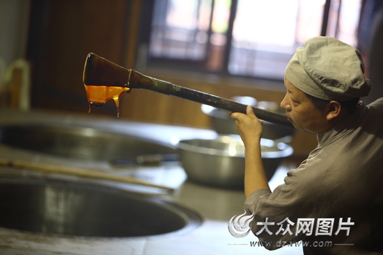 在制膠車間大眾網記者看到,熬出的阿膠,色如琥珀、口感甜潤、味道清香,且沒有了原有阿膠的腥臭味。宏濟堂阿膠第三代傳人武祥倫向記者道出原委,樂鏡宇先生獨創阿膠“九晝夜精提精煉法”在現在得以傳承保留,在即將亮相的米蘭世博會上,宏濟堂阿膠將作為全國唯一的遵古法炮制的阿膠來展示。