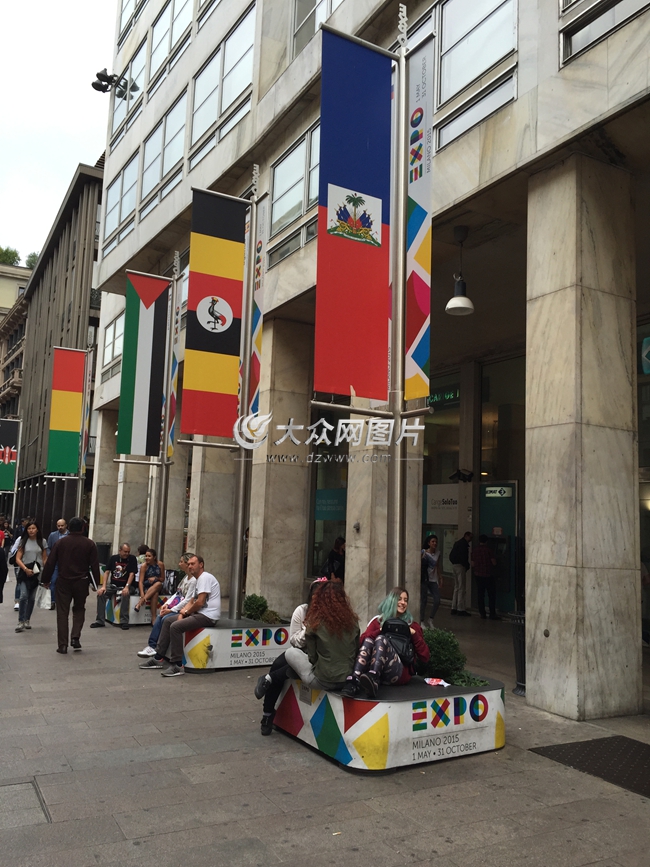 漫步在米蘭街頭,不經意間,到處都有世博會的影子。在米蘭大教堂大屏幕上在循環播放著2015意大利米蘭世博會的官方宣傳片。郵局前、商店門口,四處可見世博會的旗幟。