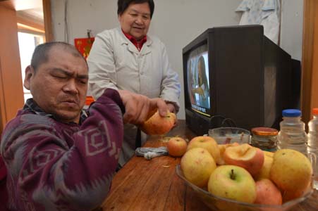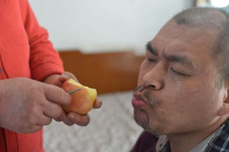 德斌十分認(rèn)真地把母親削好的蘋果擺放到果盤里,常人隨手就能做的一個(gè)簡(jiǎn)單動(dòng)作,他卻要費(fèi)九牛二虎之力去完成。