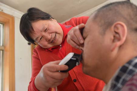 宋艷花用一個(gè)理發(fā)用的舊式電推子給德斌剃胡子。宋艷花當(dāng)初學(xué)手藝就是為了給德斌理發(fā),后來(lái)開起理發(fā)店補(bǔ)貼家用,從1979年一直開到現(xiàn)在。