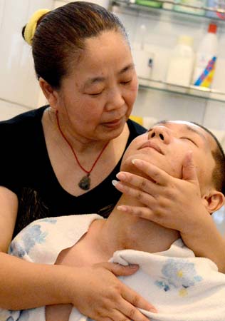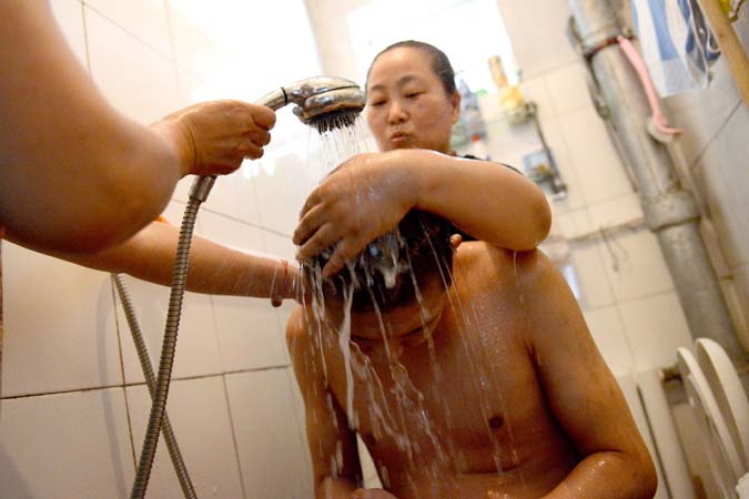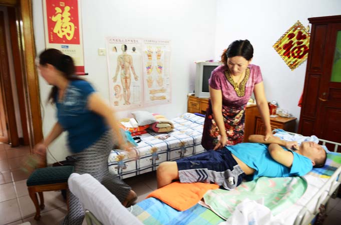 房愛玲為防止兒子得上褥瘡,每天都為兒子擦拭全身。