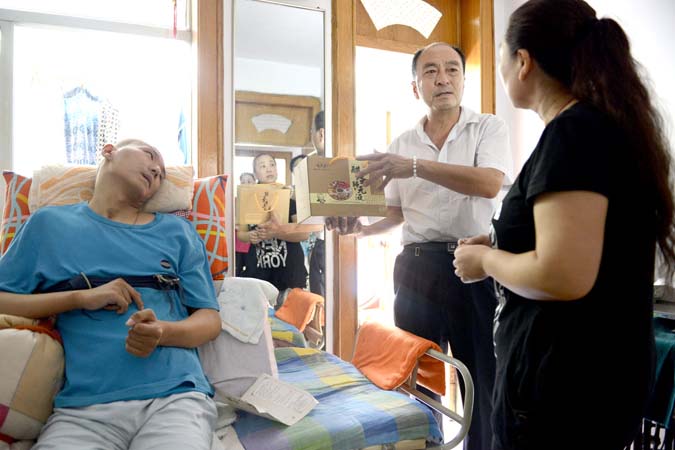 愛心人士馮先生(中)向王翀的母親介紹保健品的使用方法。當(dāng)天,馮先生一行來到房愛玲家中,給王翀送去了募捐的善款和保健品。