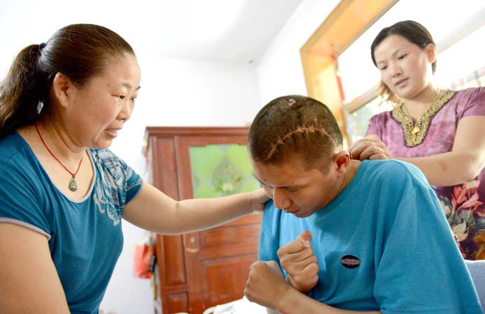 那時的王翀只能直挺挺地躺著,身體對外界的刺激毫無反應(yīng)。給他喂個飯能花2個多小時。不張嘴,硬掰開,掰開之后送進(jìn)飯去也不會咽,急得房愛玲一頭汗,煩氣了就自己嗷嗷大哭一場,哭完再拿起勺子接著喂。